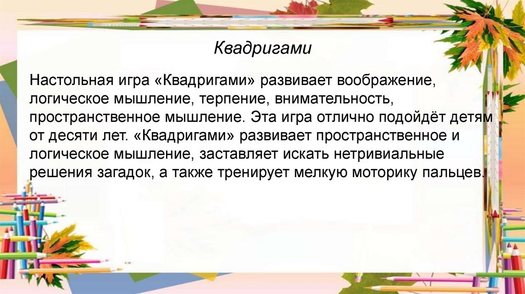 Настольная игра «Квадригами» развивает воображение,логическое мышление, терпение, внимательность,