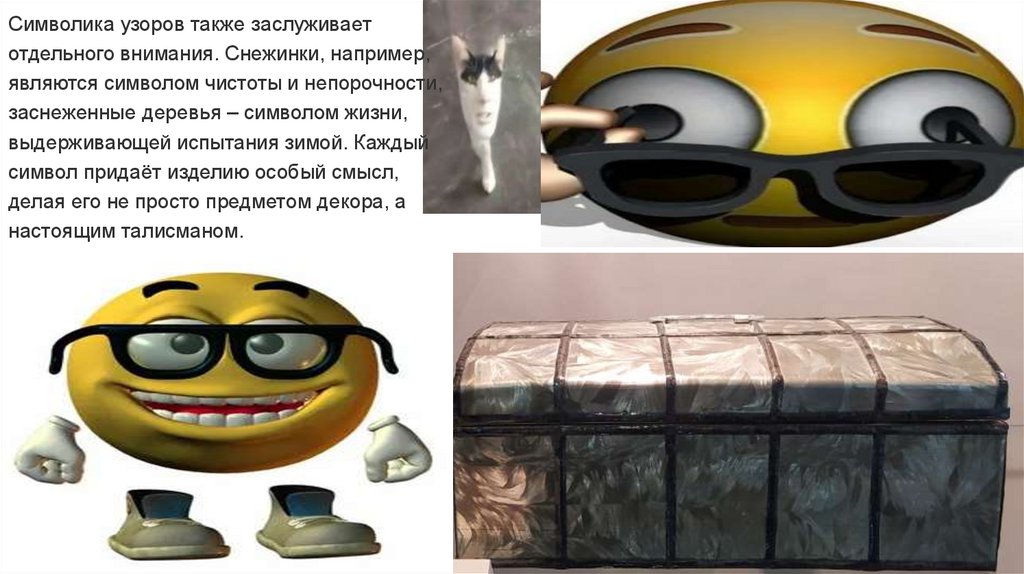 Символика узоров также заслуживаетотдельного внимания. Снежинки, например,