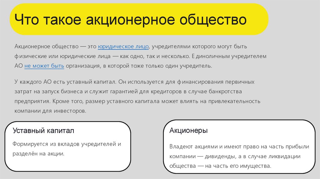 Что такое акционерное обществоАкционерное общество — это юридическое лицо, учредителями которого могут быть