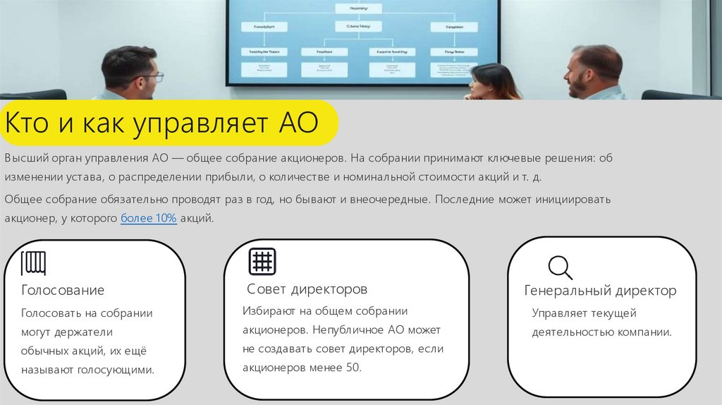 Кто и как управляет АОВысший орган управления АО — общее собрание акционеров. На собрании принимают ключевые решения: об