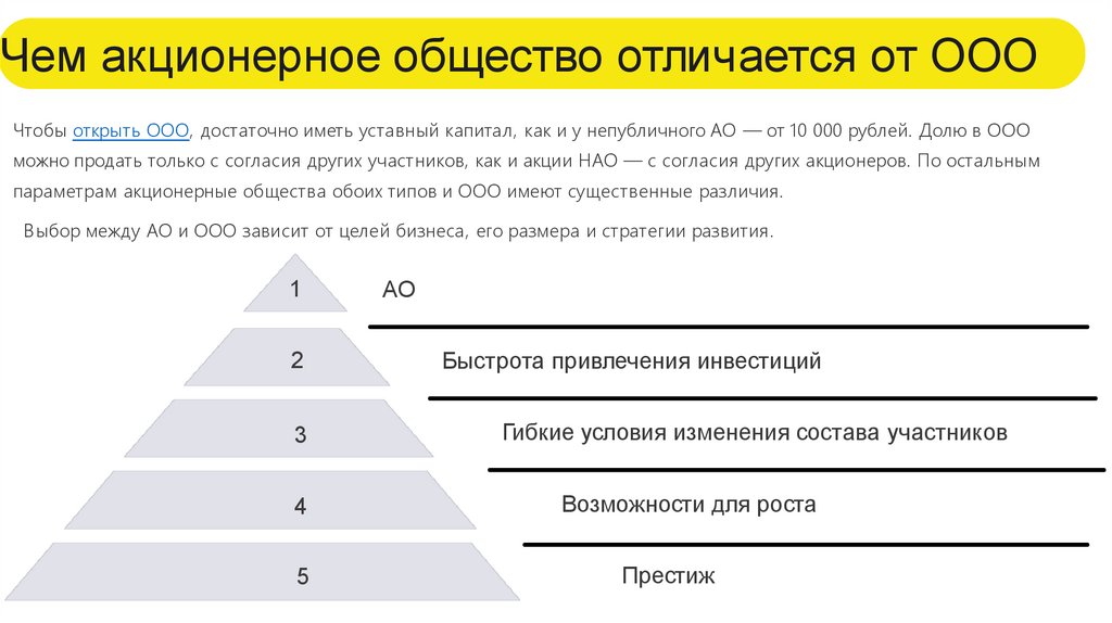 Чем акционерное общество отличается от ОООЧтобы открыть ООО, достаточно иметь уставный капитал, как и у непубличного АО — от 10 000 рублей. Долю в ООО