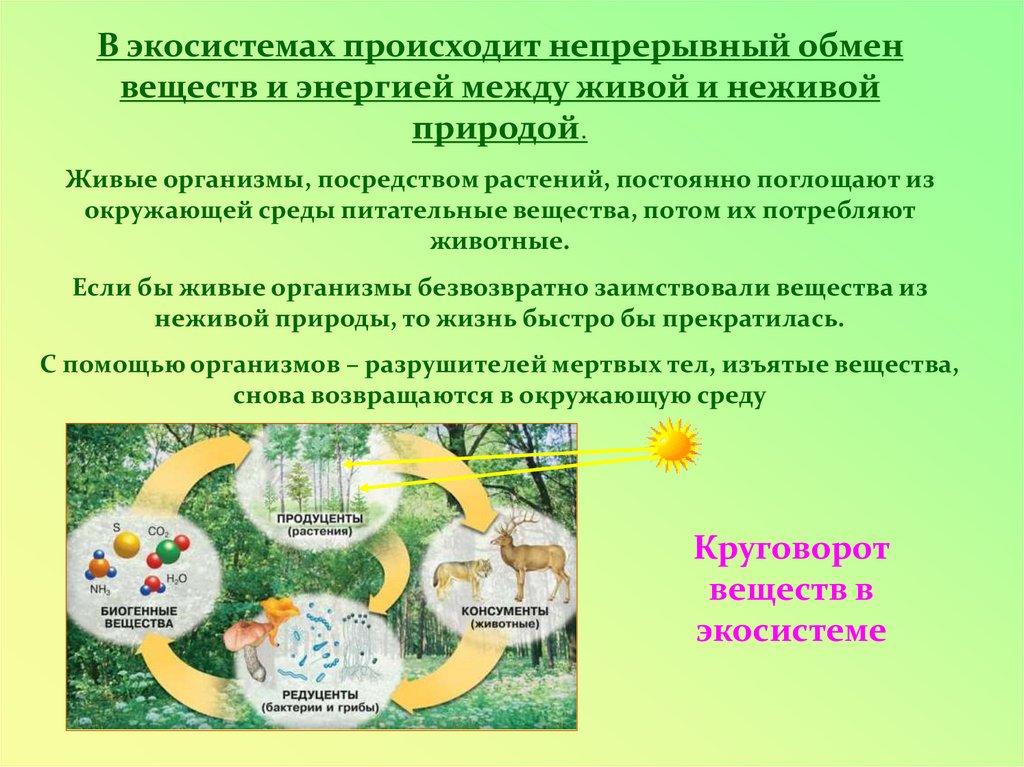 В экосистемах происходит непрерывный обменвеществ и энергией между живой и неживой