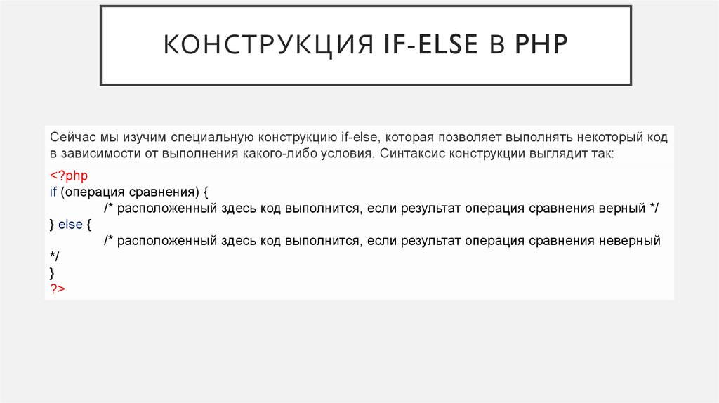 КОНСТРУКЦИЯ IF-ELSE В PHPСейчас мы изучим специальную конструкцию if-else, которая позволяет выполнять некоторый код