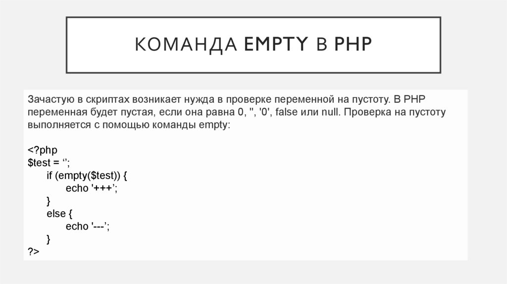 КОМАНДА EMPTY В PHPЗачастую в скриптах возникает нужда в проверке переменной на пустоту. В PHP