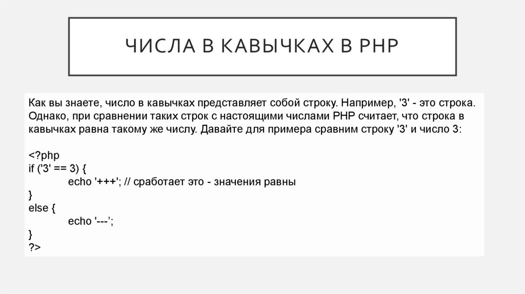 ЧИСЛА В КАВЫЧКАХ В PHPКак вы знаете, число в кавычках представляет собой строку. Например, '3' - это строка.