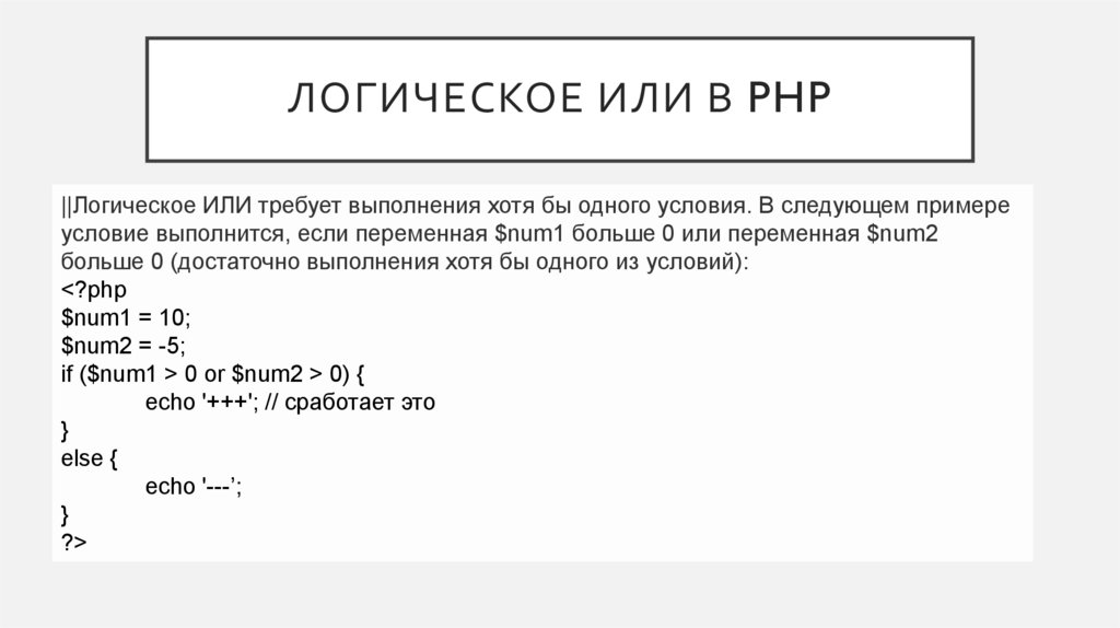 ЛОГИЧЕСКОЕ ИЛИ В PHP||Логическое ИЛИ требует выполнения хотя бы одного условия. В следующем примере