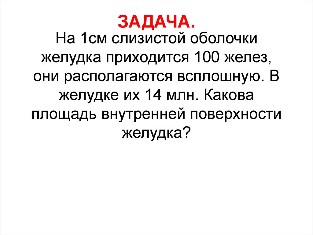 14. На 1см слизистой оболочки желудка приходится 100 желез, они располагаются всплошную. В желудке их 14 млн. Какова площадь