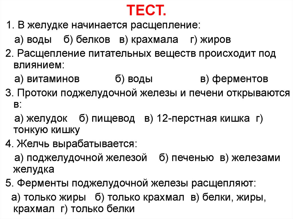 1. В желудке начинается расщепление:а) воды б) белков в) крахмала г) жиров