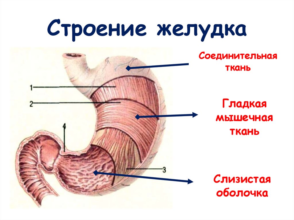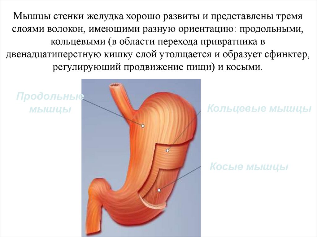 Мышцы стенки желудка хорошо развиты и представлены тремяслоями волокон, имеющими разную ориентацию: продольными,