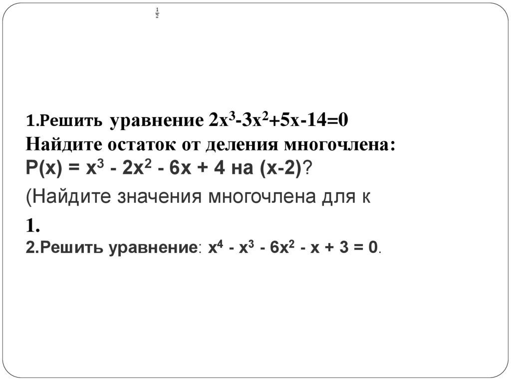 1.Решить уравнение 2х3-3х2+5х-14=0Найдите остаток от деления многочлена: