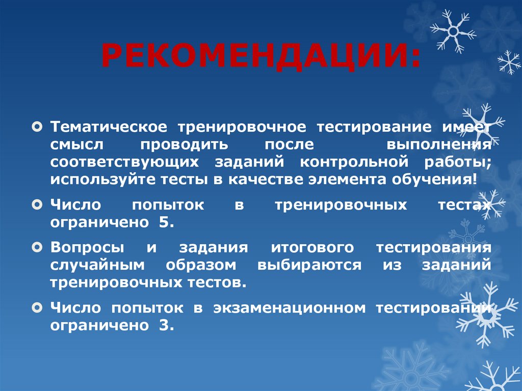 РЕКОМЕНДАЦИИ:Тематическое тренировочное тестирование имеет