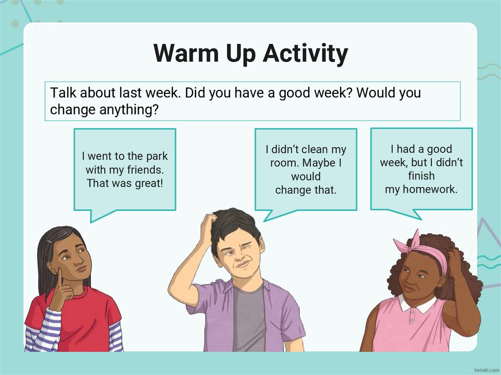 Warm Up ActivityTalk about last week. Did you have a good week? Would you