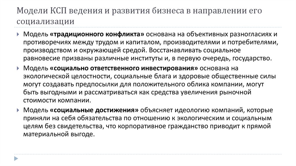 Модели КСП ведения и развития бизнеса в направлении егосоциализации