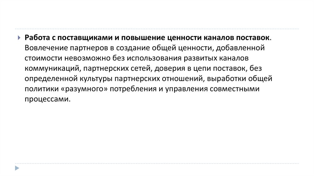 Работа с поставщиками и повышение ценности каналов поставок.Вовлечение партнеров в создание общей ценности, добавленной