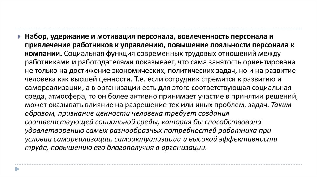 Набор, удержание и мотивация персонала, вовлеченность персонала ипривлечение работников к управлению, повышение лояльности персонала к
