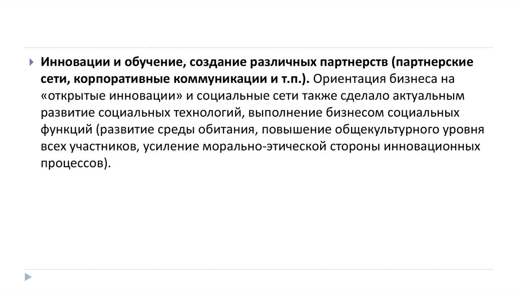 Инновации и обучение, создание различных партнерств (партнерскиесети, корпоративные коммуникации и т.п.). Ориентация бизнеса на