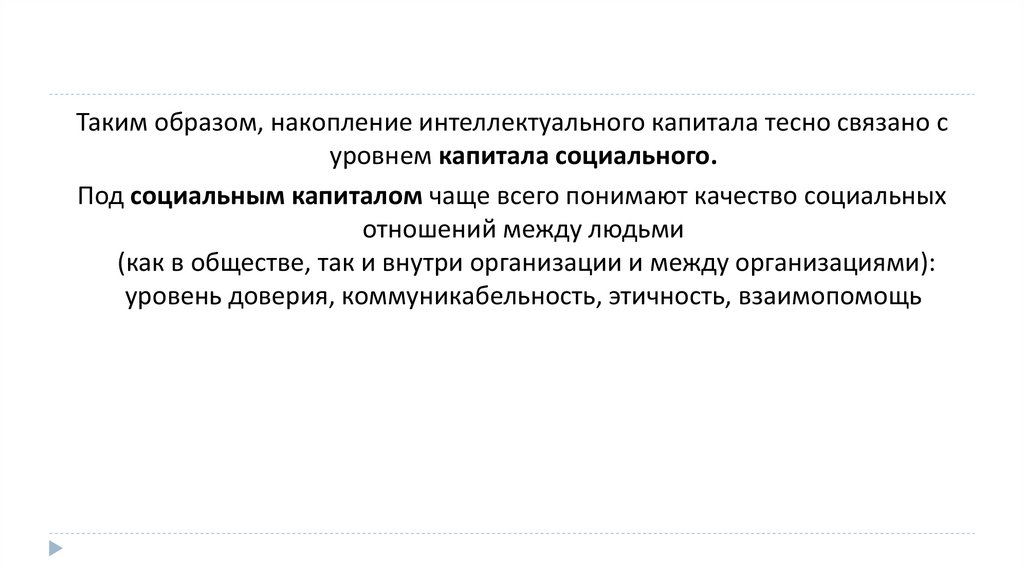 Таким образом, накопление интеллектуального капитала тесно связано суровнем капитала социального.