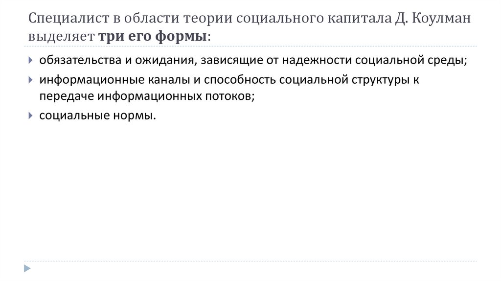 Специалист в области теории социального капитала Д. Коулманвыделяет три его формы: