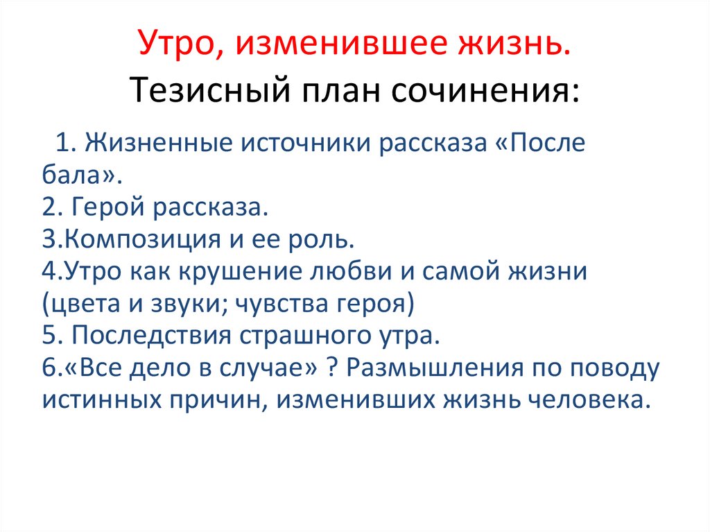 Утро, изменившее жизнь.Тезисный план сочинения: