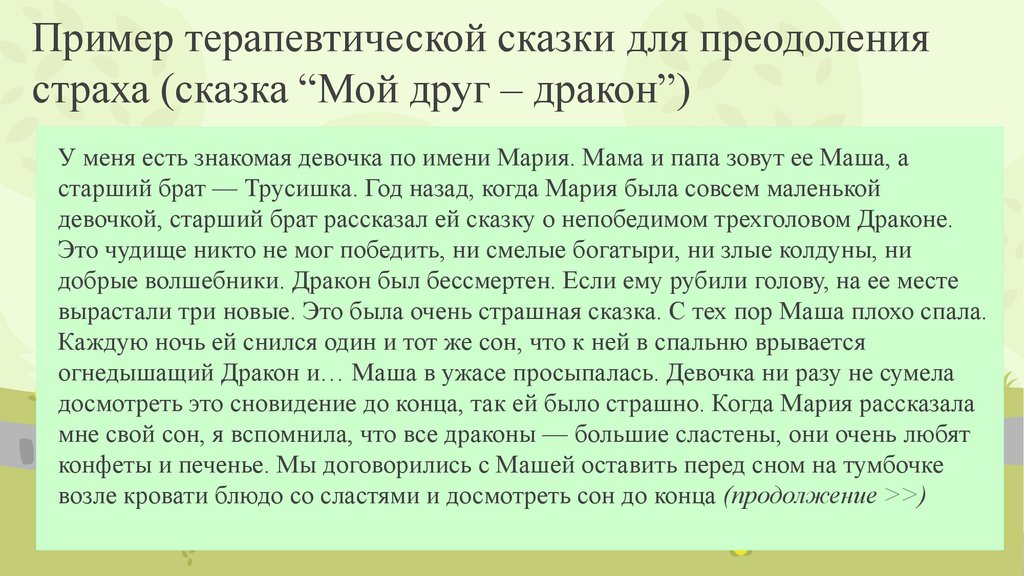 Пример терапевтической сказки для преодолениястраха (сказка “Мой друг – дракон”)