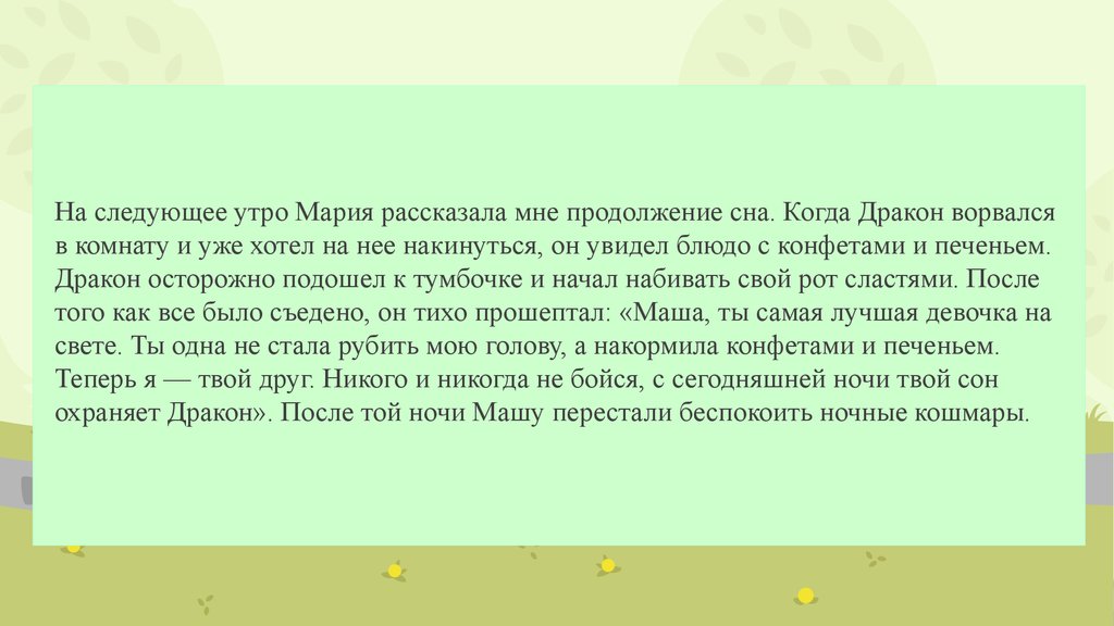 На следующее утро Мария рассказала мне продолжение сна. Когда Дракон ворвалсяв комнату и уже хотел на нее накинуться, он увидел блюдо с конфетами и печеньем.