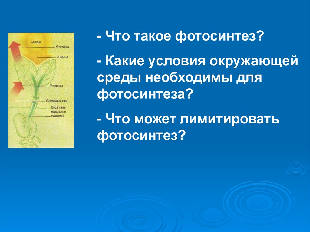 - Что такое фотосинтез?- Какие условия окружающей