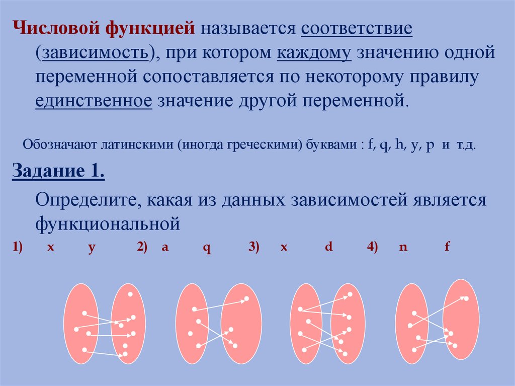 Числовой функцией называется соответствие(зависимость), при котором каждому значению одной