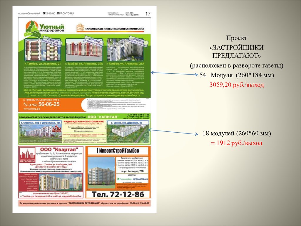 2. Модульная реклама в черно-белом варианте. Размер рекламы 6 модулей ( 84*64 мм) – 1026,00 руб 4 модуля (84*40 мм) – 684,00 руб 3 модуля (40*60 мм) – 513,00 руб и т.д