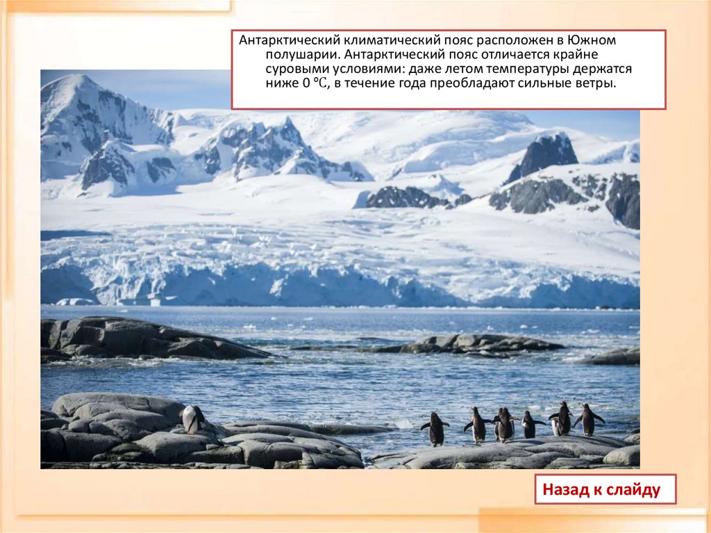 Антарктический климатический пояс расположен в Южномполушарии. Антарктический пояс отличается крайне
