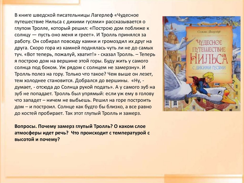 В книге шведской писательницы Лагерлеф «Чудесноепутешествие Нильса с дикими гусями» рассказывается о