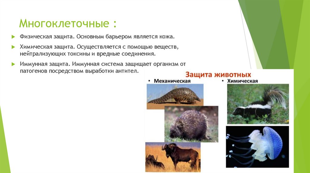 Многоклеточные :Физическая защита. Основным барьером является кожа.
