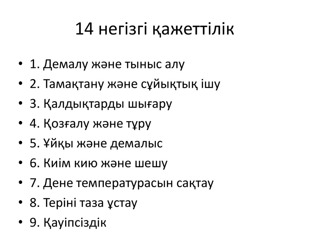 14 негізгі қажеттілік• 1. Демалу және тыныс алу