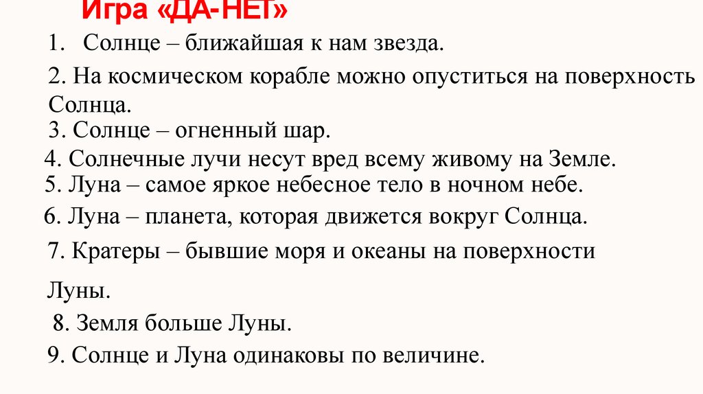 Игра «ДА-НЕТ»1. Солнце – ближайшая к нам звезда.