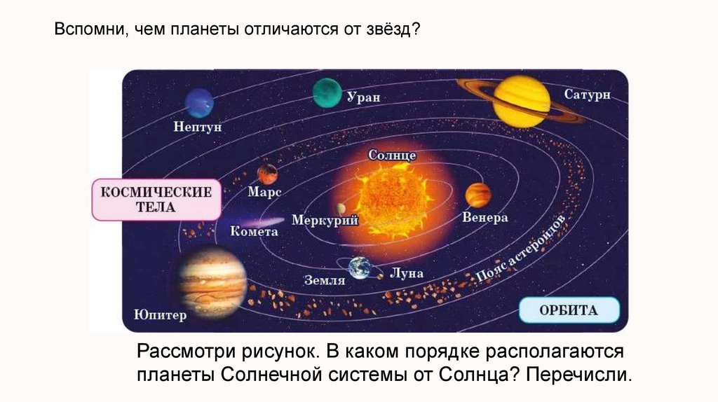 Вспомни, чем планеты отличаются от звёзд?Рассмотри рисунок. В каком порядке располагаются