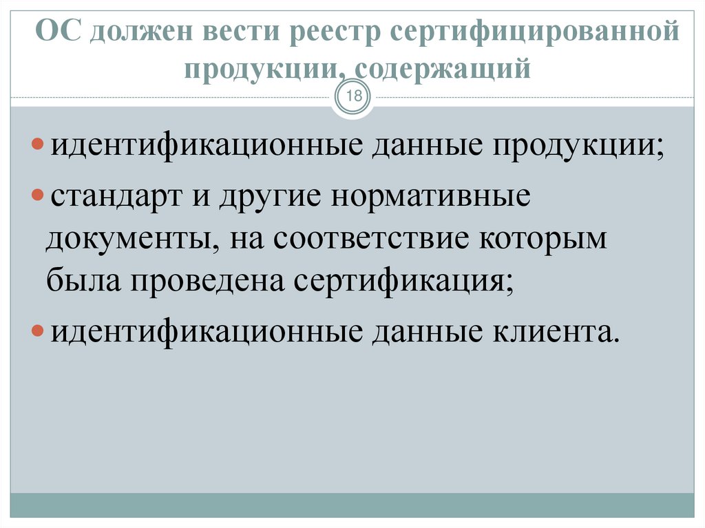18. : ОС должен вести реестр сертифицированной продукции, содержащий