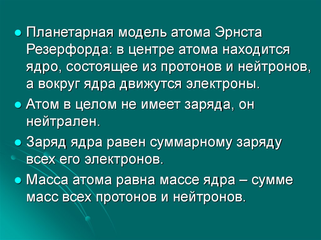 Планетарная модель атома ЭрнстаРезерфорда: в центре атома находится