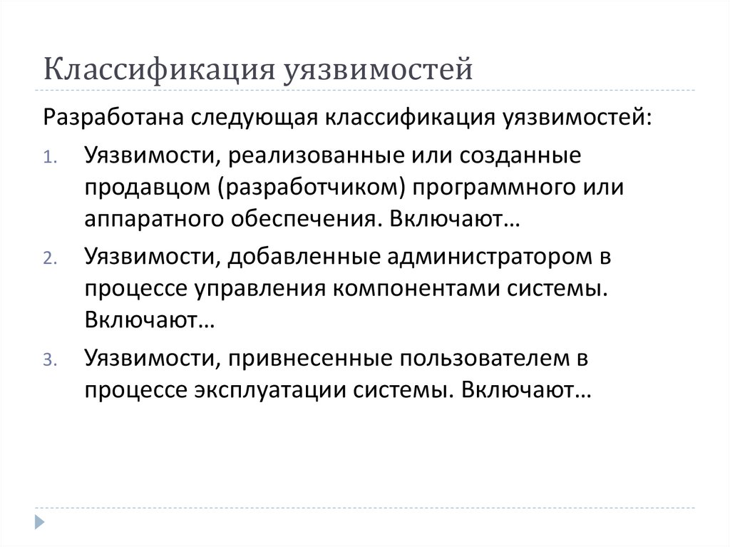 Классификация уязвимостейРазработана следующая классификация уязвимостей: