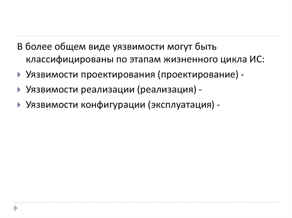 В более общем виде уязвимости могут бытьклассифицированы по этапам жизненного цикла ИС: