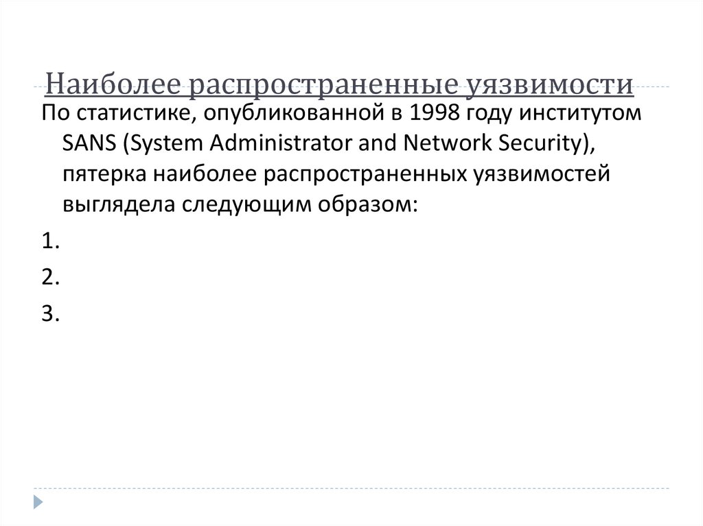 Наиболее распространенные уязвимостиПо статистике, опубликованной в 1998 году институтом