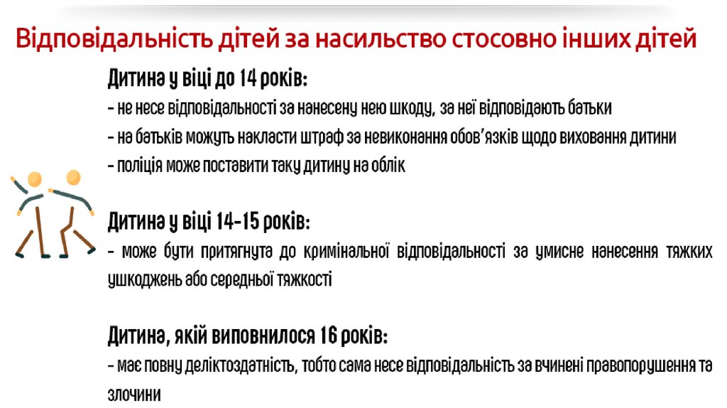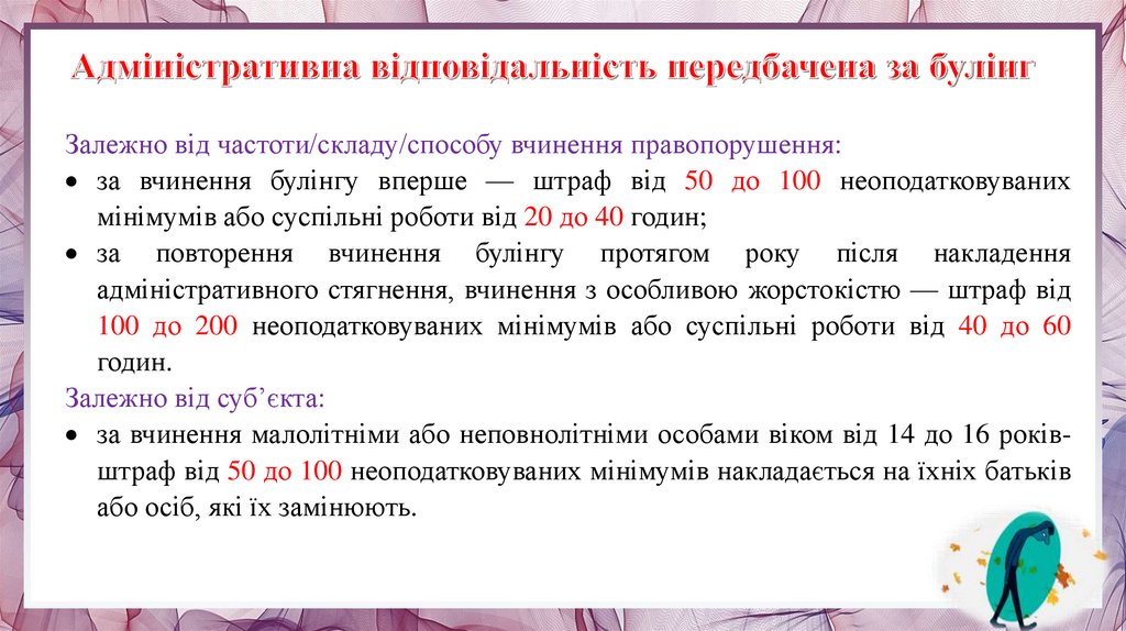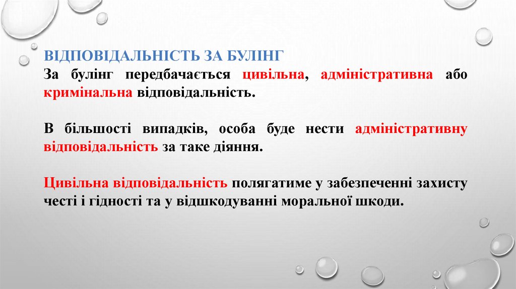 ВІДПОВІДАЛЬНІСТЬ ЗА БУЛІНГЗа булінг передбачається цивільна, адміністративна або