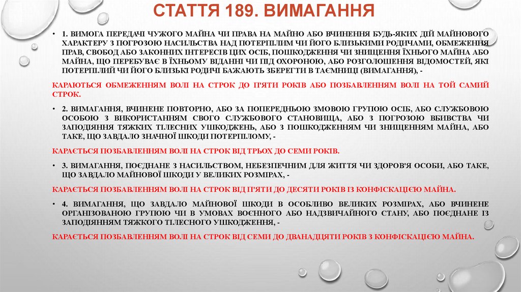 СТАТТЯ 189. ВИМАГАННЯ• 1. ВИМОГА ПЕРЕДАЧІ ЧУЖОГО МАЙНА ЧИ ПРАВА НА МАЙНО АБО ВЧИНЕННЯ БУДЬ-ЯКИХ ДІЙ МАЙНОВОГО