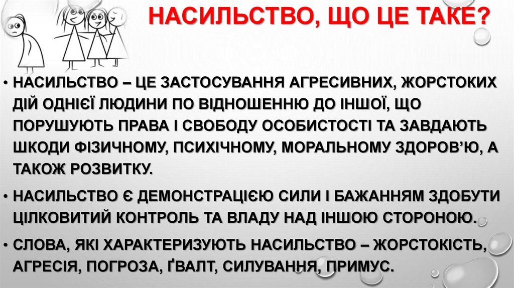 НАСИЛЬСТВО, ЩО ЦЕ ТАКЕ?• НАСИЛЬСТВО – ЦЕ ЗАСТОСУВАННЯ АГРЕСИВНИХ, ЖОРСТОКИХ