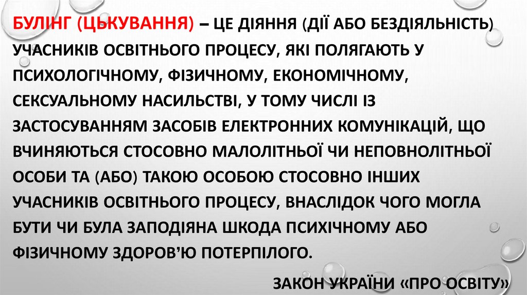 БУЛІНГ (ЦЬКУВАННЯ) – ЦЕ ДІЯННЯ (ДІЇ АБО БЕЗДІЯЛЬНІСТЬ)УЧАСНИКІВ ОСВІТНЬОГО ПРОЦЕСУ, ЯКІ ПОЛЯГАЮТЬ У