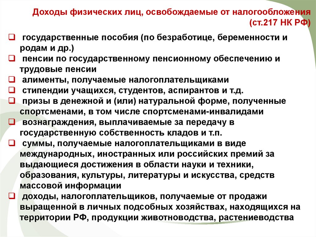Доходы физических лиц, освобождаемые от налогообложения(ст.217 НК РФ)
