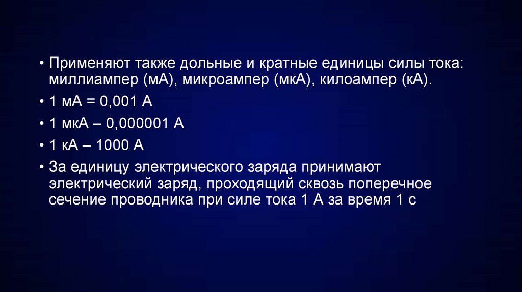 • Применяют также дольные и кратные единицы силы тока:миллиампер (мА), микроампер (мкА), килоампер (кА).