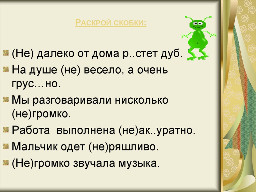РАСКРОЙ СКОБКИ:(Не) далеко от дома р..стет дуб.