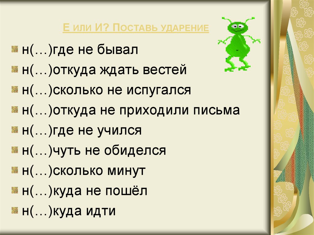 Е ИЛИ И? ПОСТАВЬ УДАРЕНИЕн(…)где не бывал