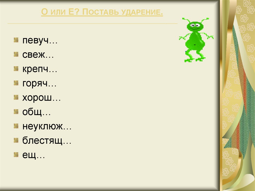 О ИЛИ Е? ПОСТАВЬ УДАРЕНИЕ.певуч…