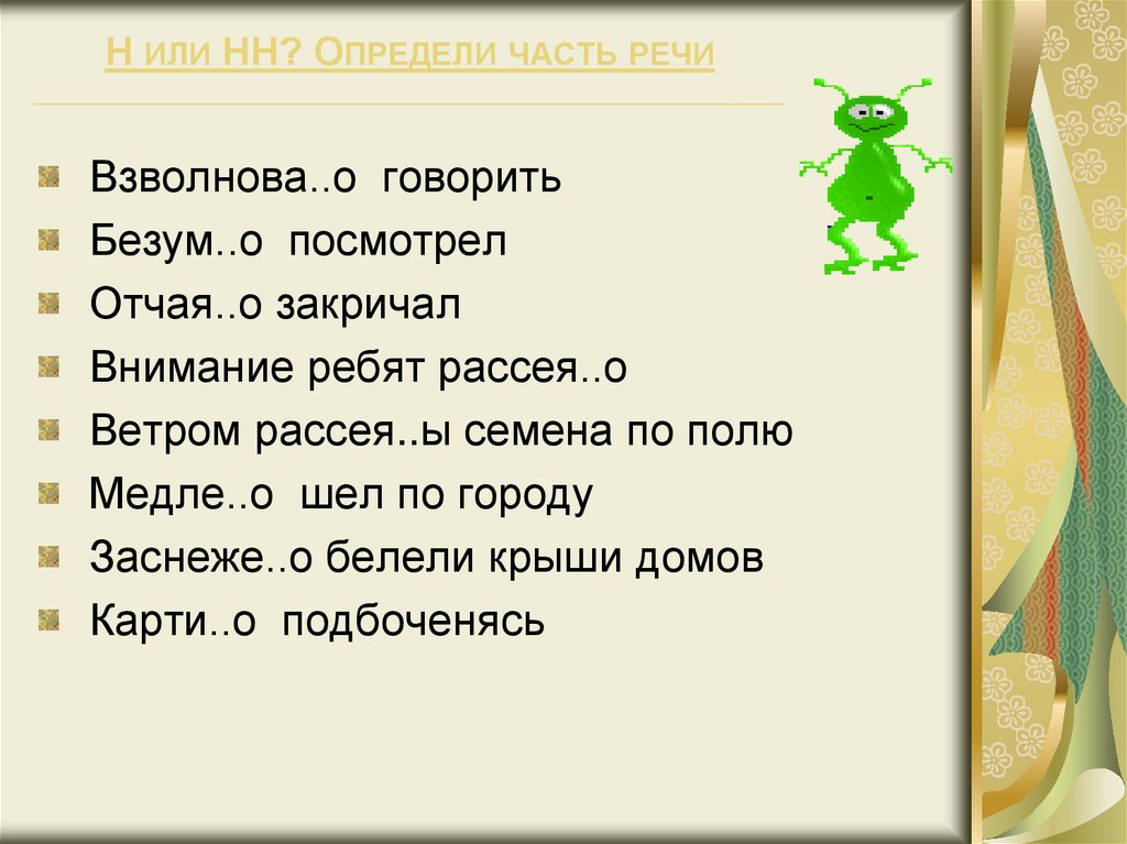Н ИЛИ НН? ОПРЕДЕЛИ ЧАСТЬ РЕЧИВзволнова..о говорить