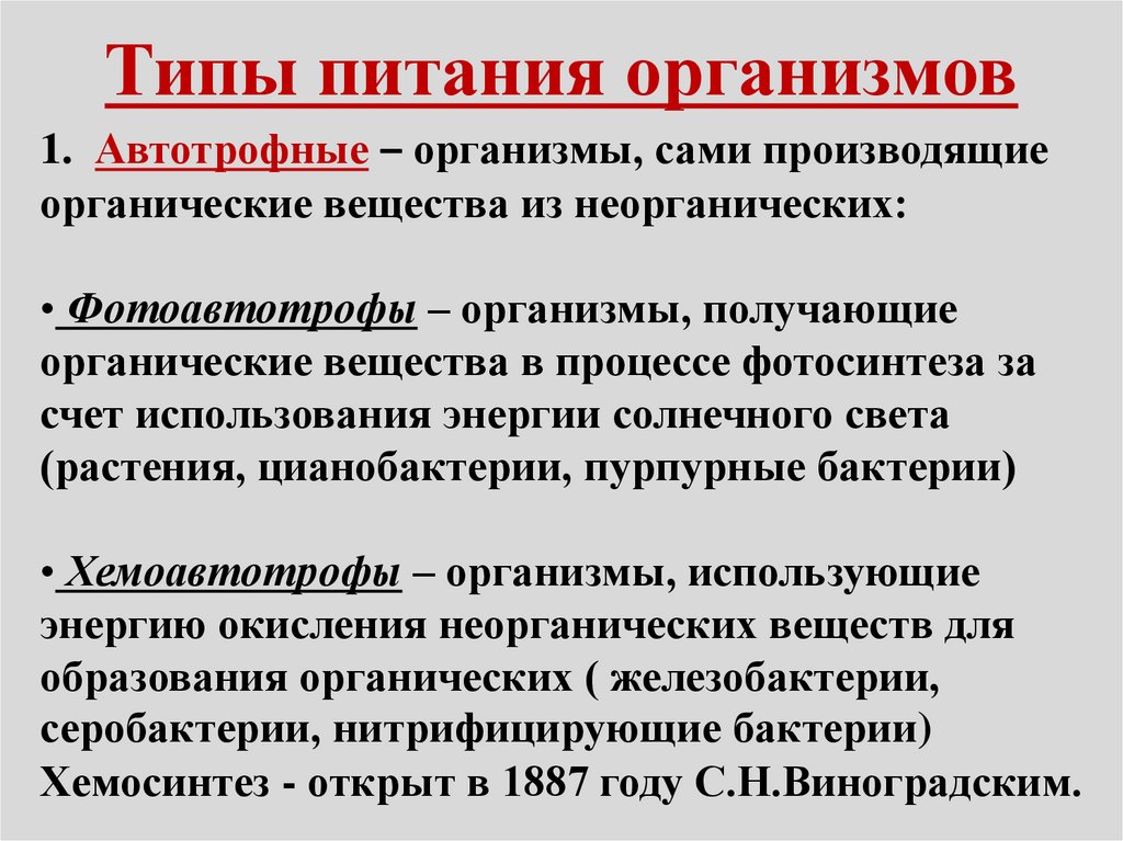 Типы питания организмов1. Автотрофные – организмы, сами производящие